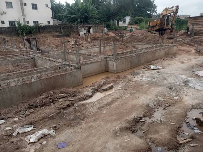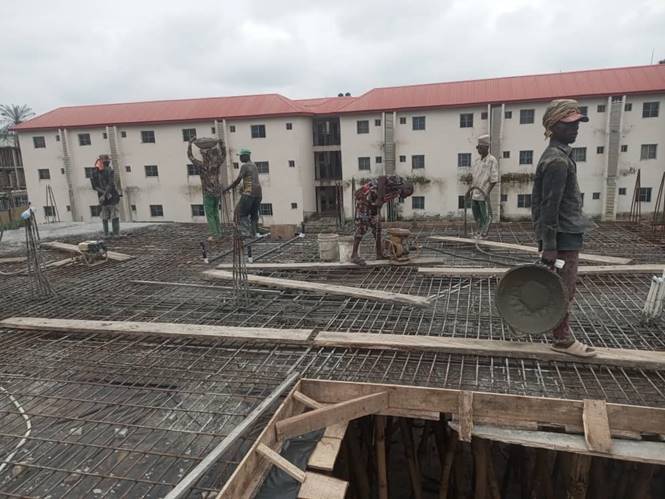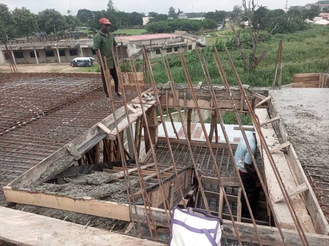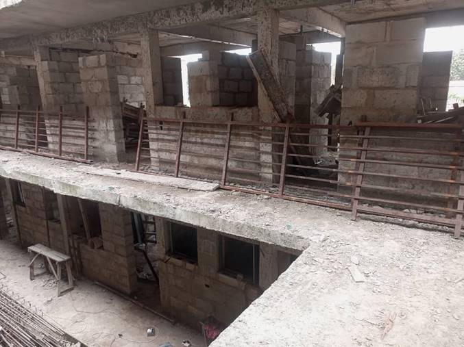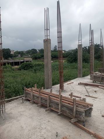 Update: The superstructure stage of the building has reached the making of the formwork for the third-floor slab. The steel reinforcement and electrical/mechanical sleeves placement on the formwork have commenced. On the ground and first floor, the casting of the doors and windows lintels into formworks is ongoing. The soffits of the first and second-floor slabs are being plastered. The steel handrails for the ground and first-floor slabs are being prepared for fixing into position.